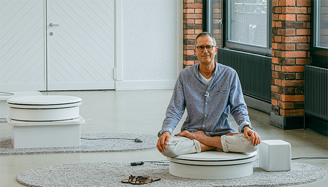 Einst Rundrücken, schiefe Wirbelsäule und verschobenes Becken: Heute sitzt Andreas Heine kerzengerade im Lotossitz auf dem von ihm entwickelten Provibes.