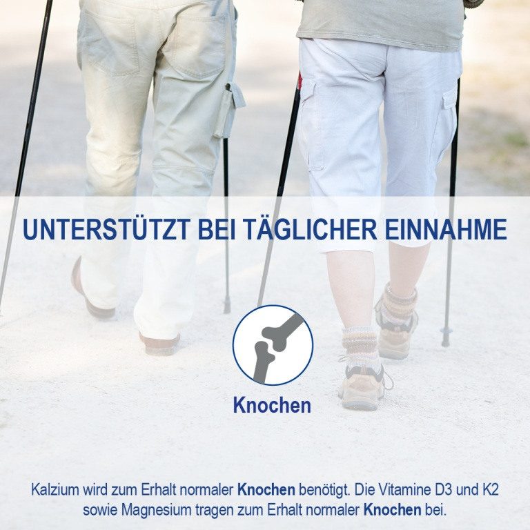 - Vitamin K2: Als Verkehrspolizist steuert Vitamin K2 das aufgenommene Kalzium präzise in die Knochenmatrix und beugt damit unnötigen Ablagerungen in den Gefäßen vor. Vitamin K trägt so zur Erhaltung normaler Knochen bei. Die Verwendung der all-trans-Form Menaquinon MK-7 sichert dabei eine besonders hohe Bioverfügbarkeit.