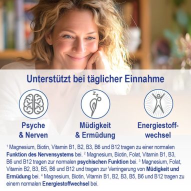 Super Relax nutzt die Kraft von B-Vitaminen und Magnesium, um Nerven und Psyche gezielt zu unterstützen. Die B-Vitamine stammen aus gekeimtem Buchweizen und sind in ihrer natürlichen Vielfalt enthalten. Magnesium liegt in zwei hochwertigen Formen vor: als Magnesium-Bisglycinat, gebunden an die Aminosäure Glycin, und als Meeres-Magnesium aus der Atlantik-Rotalge Lithothamnium, das über 70 Spurenelemente liefert. Diese Kombination hilft, Müdigkeit zu reduzieren, Energie zu erhalten und die psychische Belastbarkeit zu stärken.
