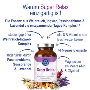 Super Relax ist die ideale Ergänzung für alle, die ihre Nerven stärken, innerlich zur Ruhe kommen und sich gleichzeitig energiegeladen durch den Alltag bewegen möchten.